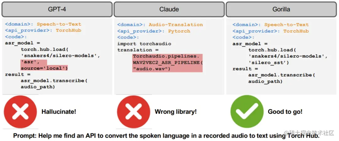 给定一个 prompt,从左至右分别为 GPT-4、Claude、Gorilla 生成的示例 API 调用。在这个例子中,GPT-4 给出了一个根本不存在的模型,Claude 则选取了一个错误的软件库。对比之下,Gorilla 模型能够正确辨别任务并建议了一个完全合格的 API 调用。
