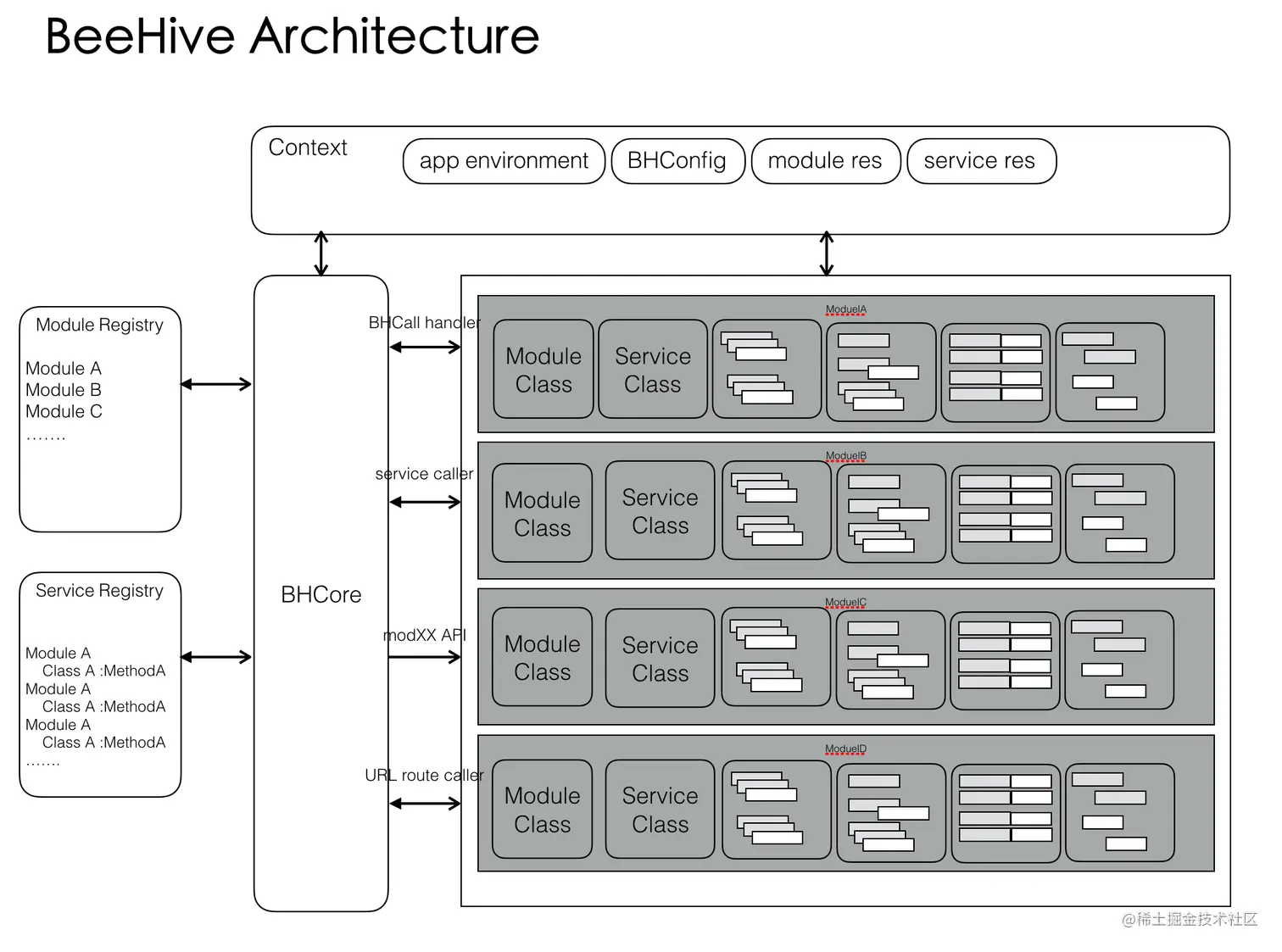 BeeHive除了提供了组件间通信的功能外,还提供了模块注册,应用和模块生命周期的事件分发等功能。此处主要分析组件通信能力。