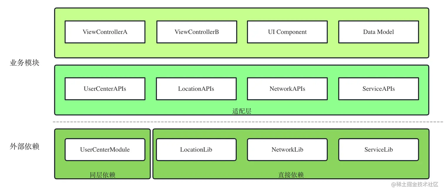 模块中适配层要做的事情,举例来说无论是依赖SDWebImage还是Kingfisher实现图片加载,对业务模块内部都适配成loadImage一类的接口,外部接口不会对内部造成侵入。