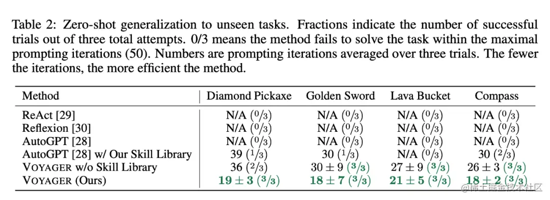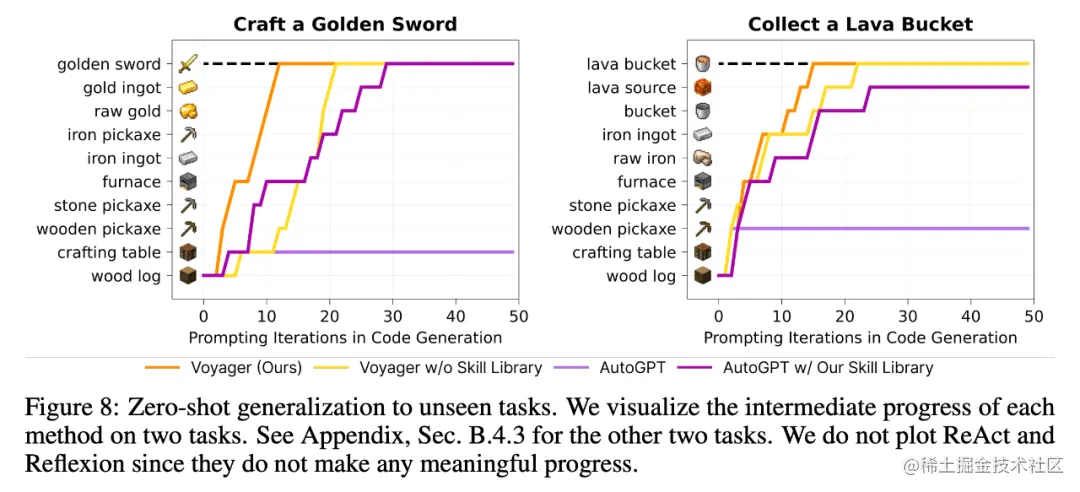 如表 2 和图 8 所示,VOYAGER 可以持续地解决所有的任务,而基线不能在 50 次 prompt 迭代内解决任何任务。值得注意的是,从终身学习中构建的技能库不仅增强了 VOYAGER 的性能,而且也给 AutoGPT 带来了提升。这表明,技能库是一个多功能的工具,可以随时被其他方法所采用,有效地作为一种即插即用的资产来提高性能。