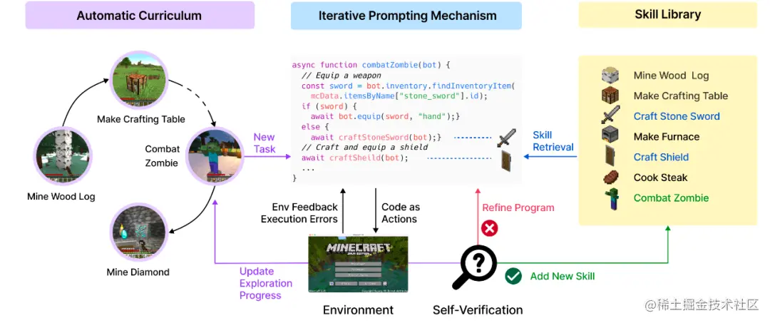 VOYAGER 由三个新型组件组成:(1) 自动课程,用于提出开放式探索的目标;(2) 技能库,用于开发越来越复杂的行为;(3) 迭代 prompt 机制,用于为具身控制生成可执行代码。