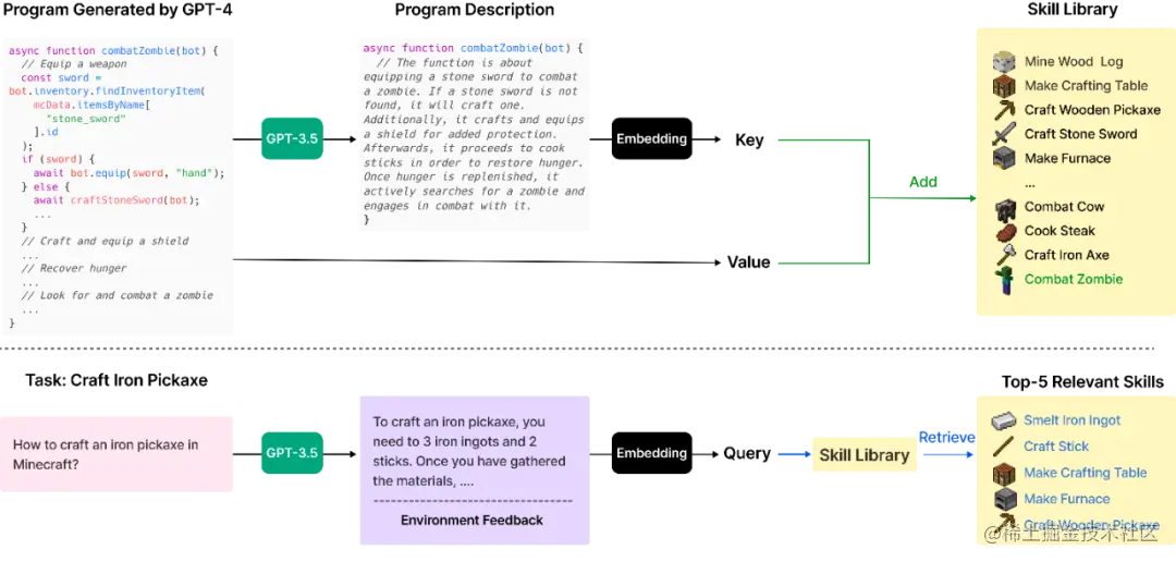 具体来说,技能库的顶部用于添加新技能。每个技能都通过其描述的嵌入进行索引,将来可以在类似情况下检索到。