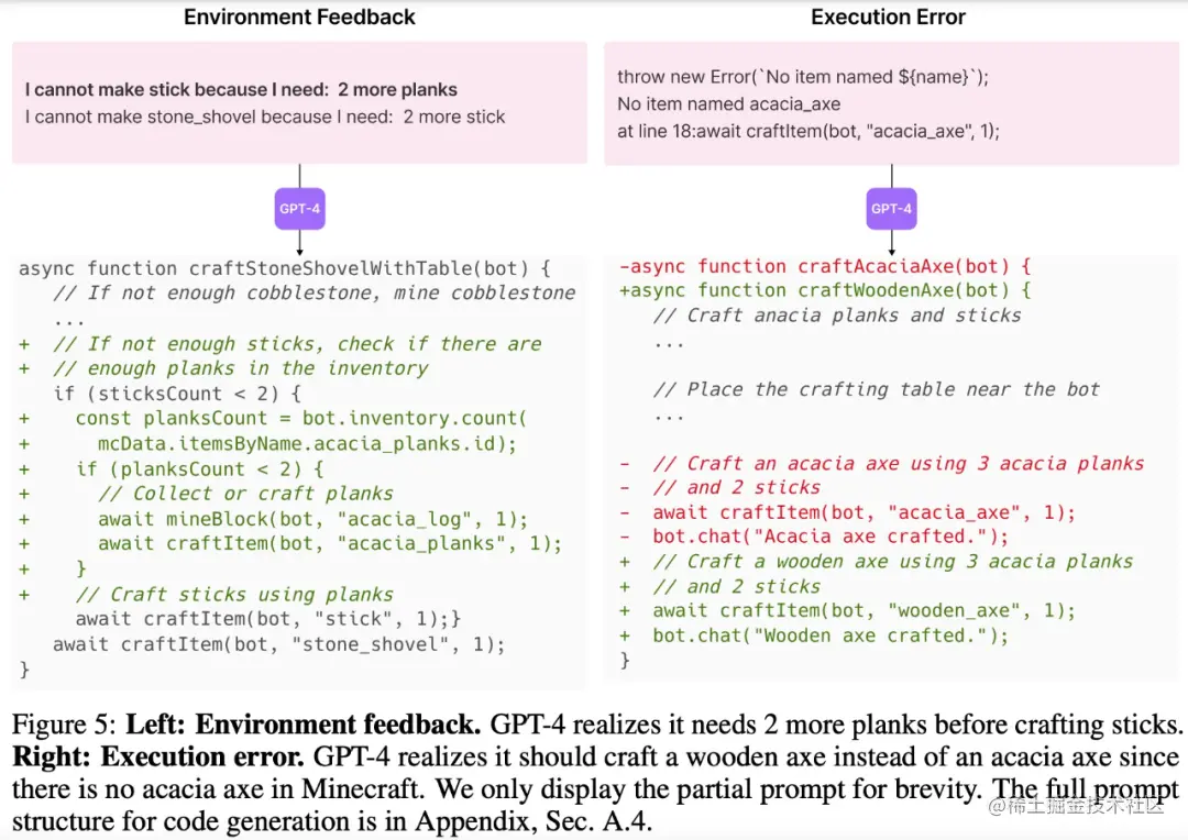 下图(左)是一个环境反馈的例子:GPT-4 意识到在制作木棍之前还需要 2 个木板。执行错误的例子如下图(右)所示, GPT-4 意识到它应该制作木斧而不是灌木斧,因为《我的世界》中没有灌木斧。