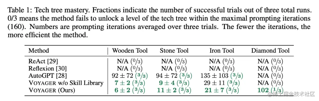 在表 1 中,分数表示三次总运行中的成功试验次数。数字是三次试验中平均的 prompt 迭代次数,迭代次数越少,方法就越有效。与基线相比,VOYAGER 解锁木质等级的速度快了 15.3 倍(就 prompt 迭代而言),解锁石质等级快了 8.5 倍,解锁铁质等级快了 6.4 倍,VOYAGER 是唯一能解锁科技树中钻石等级的模型。