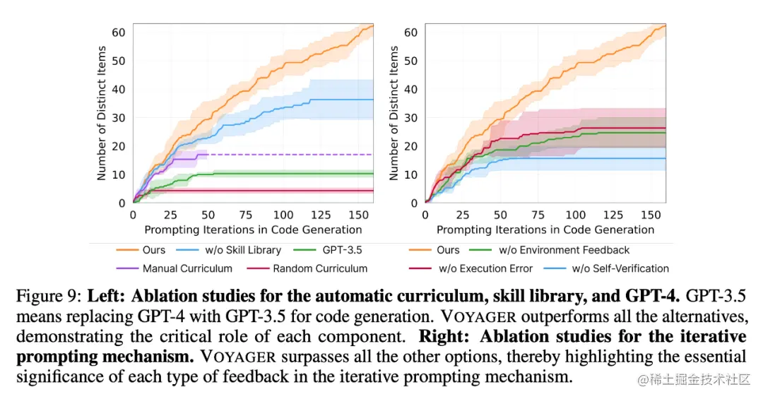 VOYAGER 的性能优于所有替代方案,表明了每个组件的关键作用。此外,GPT-4 在代码生成方面明显优于 GPT-3.5。