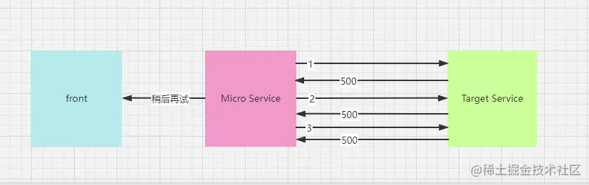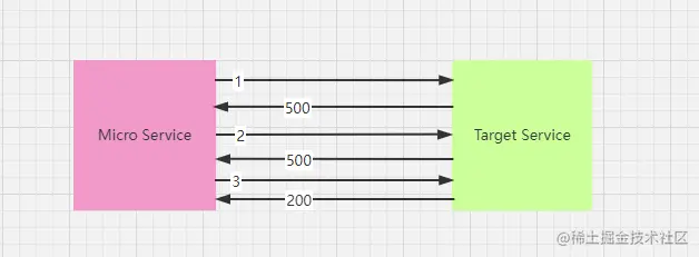 重试次数也要根据实际情况来设置,如果一直重试,而服务一直无法恢复,那么也会消耗资源,并且用户导致用户请求一直在等待,用户体验不好,设置设置次数过少,那么可能会导致没有足够重试,从而导致浪费了一些重试次数,最后还没有成功,如下,第三次就重试成功,如果设置为两次,那么前两次没有成功就返回,用户还需重新再发起请求。