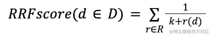 另一种方法是 RRF 算法,它提供了出色的排序方法零样本混合,正如学术研究所证明的那样。 如果你不了解不同方法中排名分数的确切分布,这不仅是最好的混合方式,而且客观上也是混合排名方法的好方法 —— 即使你知道如何归一化及分数的分布情况,也很难被击败。 基本概念是结果的组合顺序由每个结果集中每个文档的位置(和存在)定义。 因此可以方便地忽略排名分数。