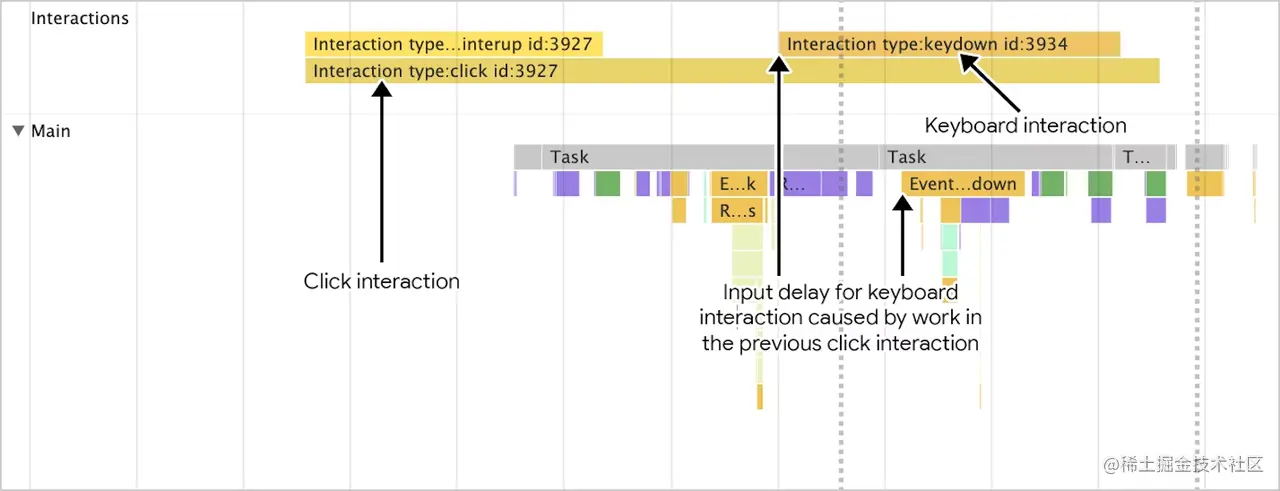 它不仅仅测量首次交互,而是所有交互延时。除了输入延时,还包括事件处理时长,渲染延时。它的目标是确保从用户开始交互到下一帧绘制的时间尽可能短,以满足用户进行的所有或大多数交互。
