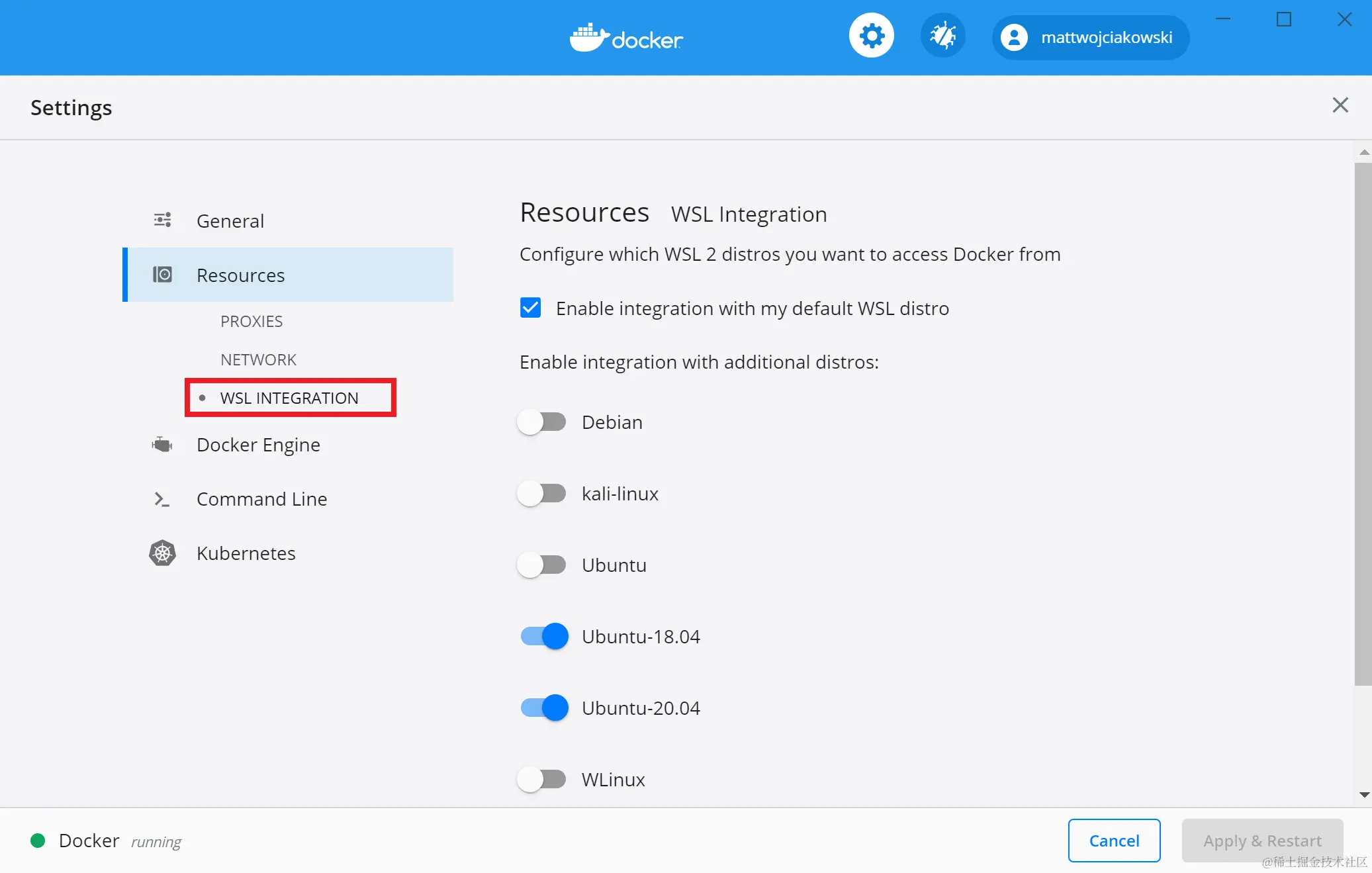 - 通过转到“设置”>“资源”>“WSL 集成”,从要启用 Docker 集成的已安装 WSL 2 发行版中进行选择。 Docker Desktop 资源设置