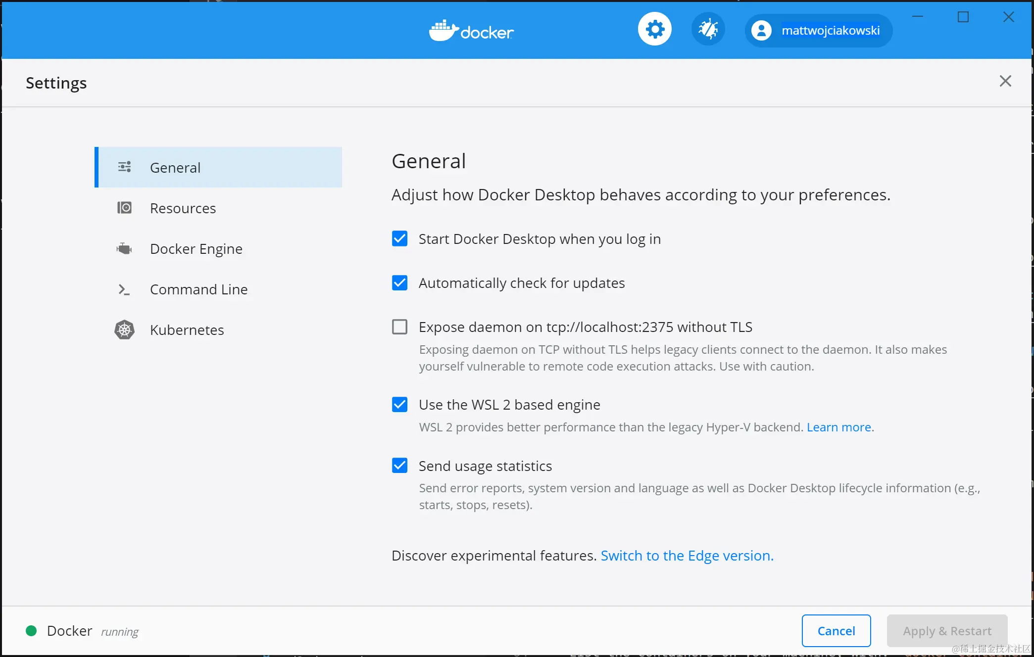 - 确保在“设置”>“常规”中选中“使用基于 WSL 2 的引擎”。 Docker Desktop 常规设置