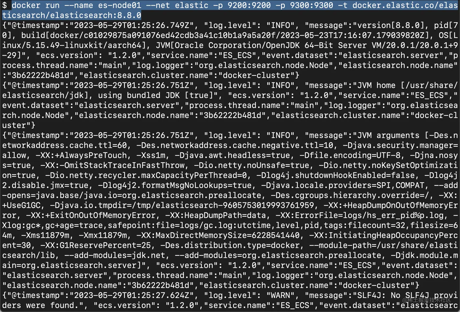 docker run --name es-node01 --net elastic -p 9200:9200 -p 9300:9300 -t docker.elastic.co/elasticsearch/elasticsearch:8.8.0