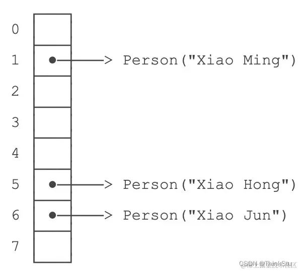 - 如果key的值为"a",计算得到的索引总是1,因此返回value为Person(“Xiao Ming”),这样就不必遍历整个数组,即可直接读取key对应的value。(内部的一套指定算法)