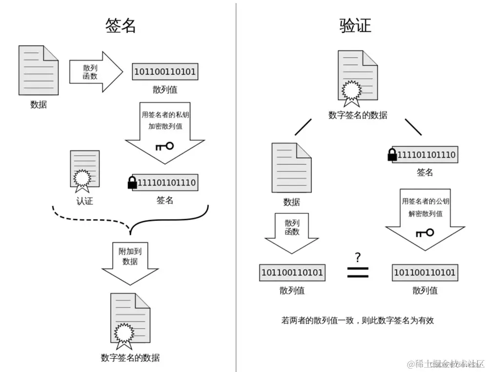 - 验证时,先将数据经过散列得到Hash1,再将签名公匙解密得到Hash2,两者进行比对。