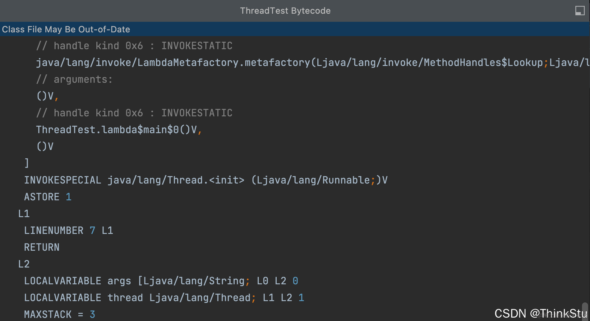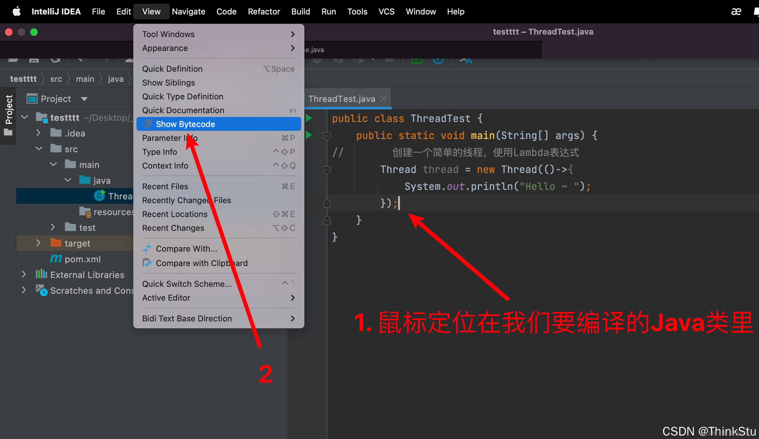 IDEA查看Java字节码文件 ThinkStu 2023-05-29 432 阅读1分钟 在Java项目开发的过程中,我们有时候需要获得Java的字节码文件( .class文件 ),以便加深对问题的理解与排查。 步骤: 1. 单击IDEA右侧的Maven工程管理,选择生命周期控制(lifecycle),打包(package)。 2. 在生成的 target目录中找到我们需要的类,把鼠标的光标定位在类里面,然后选择顶部菜单栏 View,show Bytecode,获得字节码文件。 最终成果