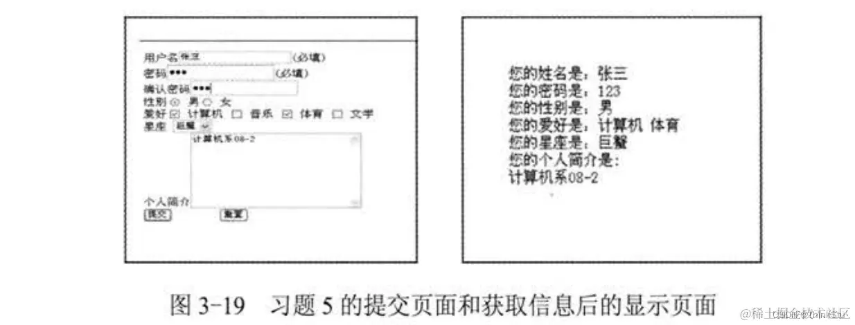 - 设计一个用户注册表单,其提交页面和信息获取后显示页面,如图 3-19 所示,用户填写完并提交后输出用户填写的信息。