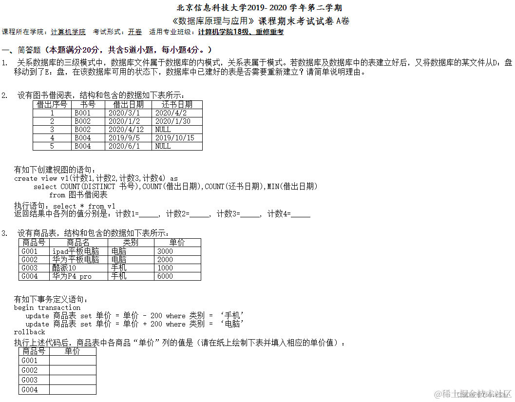 北京信息科技大学2018级数据库原理与应用期末试卷