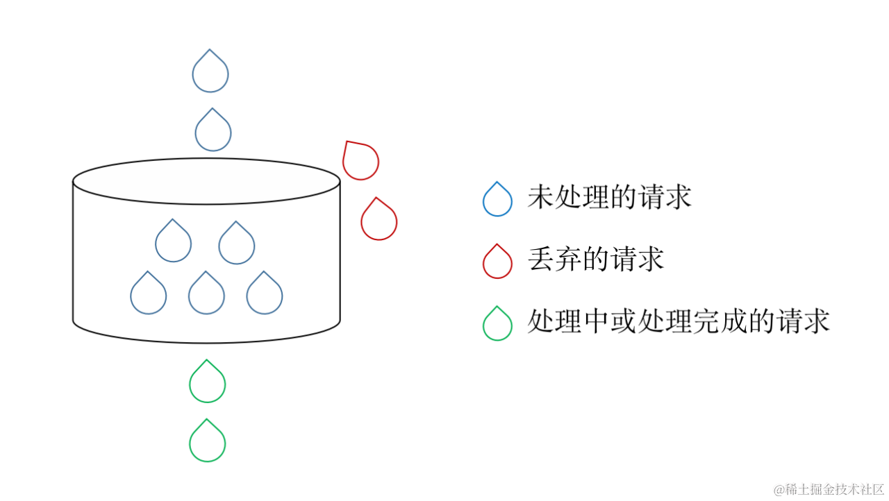 nginx 的 ngx_http_limit_req_module 模块提供限制请求处理速率的能力,使用了漏桶算法(leaky bucket algorithm)。我们可以想像有一只上面进水、下面匀速出水的桶,如果桶里面有水,那刚进去的水就要存在桶里等下面的水流完之后才会流出,如果进水的速度大于水流出的速度,桶里的水就会满,这时水就不会进到桶里,而是直接从桶的上面溢出。对应到处理网络请求,水代表从客户端来的请求,而桶代表一个队列,请求在该队列中依据先进先出(FIFO)算法等待被处理。漏的水代表请求离开缓冲区并被服务器处理,溢出代表了请求被丢弃并且永不被服务。