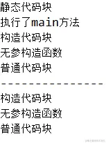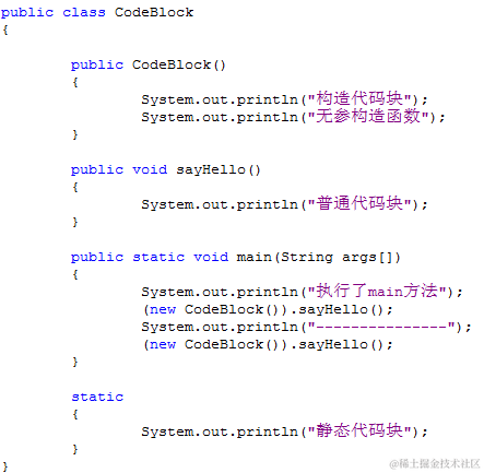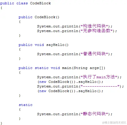 | 12345678910111213141516171819202122232425 | public class CodeBlock {`` ``static``{`` ``System.out.println(``"静态代码块"``);`` ``}`` ``{`` ``System.out.println(``"构造代码块"``);`` ``}`` ``public CodeBlock(){`` ``System.out.println(``"无参构造函数"``);`` ``}`` ``public void sayHello(){`` ``{`` ``System.out.println(``"普通代码块"``);`` ``}`` ``}`` ``public static void main(String[] args) {`` ``System.out.println(``"执行了main方法"``);`` ``new CodeBlock().sayHello();;`` ``System.out.println(``"---------------"``);`` ``new CodeBlock().sayHello();;`` ``}``} |