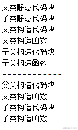 总之一句话,静态代码块内容先执行,接着执行父类构造代码块和构造方法,然后执行子类构造代码块和构造方法。