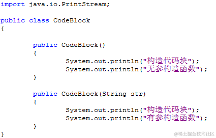 | 123456789101112 | public class CodeBlock {`` ``{`` ``System.out.println(``"构造代码块"``);`` ``}`` ``public CodeBlock(){`` ``System.out.println(``"无参构造函数"``);`` ``}`` ``public CodeBlock(String str){`` ``System.out.println(``"有参构造函数"``);`` ``}``} |