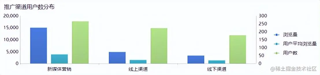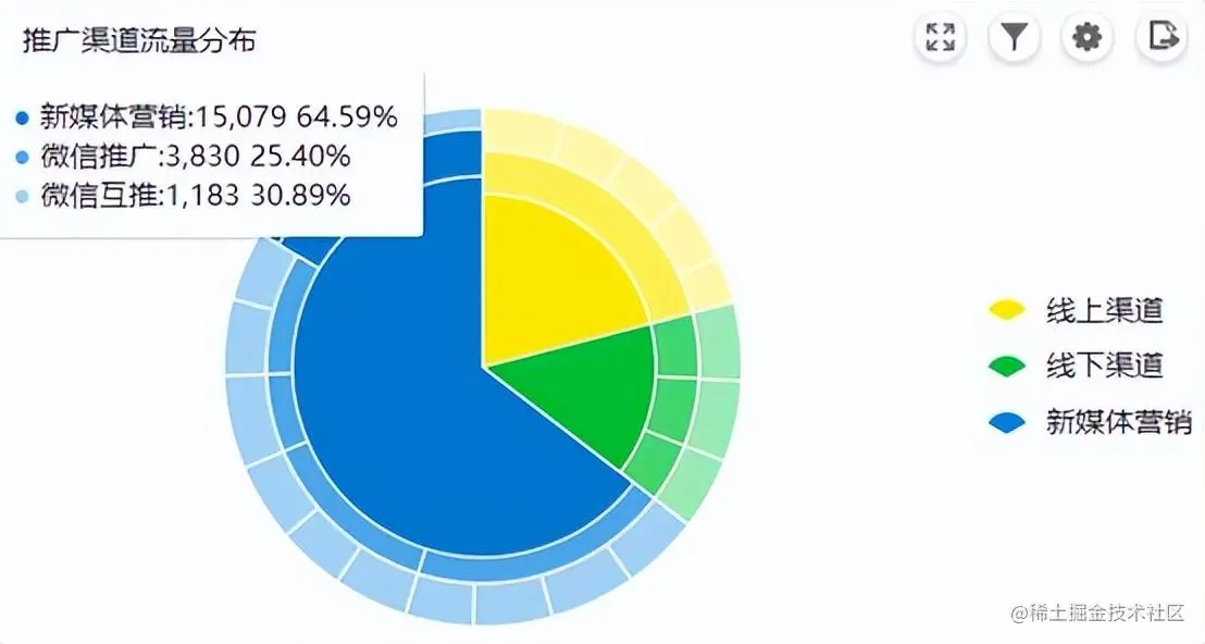 如上图所示,由于推广渠道是分多层级的,我们通过FineBI工具的多层饼图进行数据的分析统计再合适不过了。分析下图的数据我们可以看出,首先是一级渠道的主要战斗力来自于新媒体营销,当今的微信、知乎等社交媒介社区时代受众广泛,用户群体非常庞大,是公司需要投入主要成本进行推广的。其次线上渠道的效果也不容忽视,对于互联网企业来说,做好百度、Google等SEO搜索引擎关键词推广也是很重要的一部分工作。相较于线上渠道和新媒体营销,线下渠道说所需要的经费和时间、人力成本较大,受众又相对较小,所以此类活动往往针对核心粉丝进行运营即可。