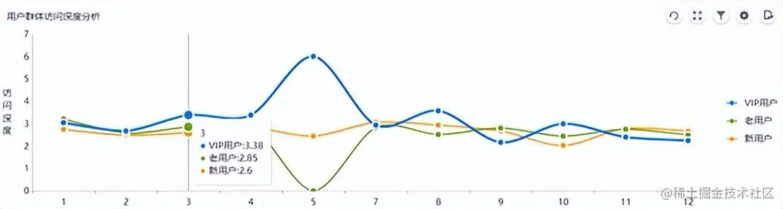 如上图所示,我们通过BI工具将企业的VIP用户、老用户、新用户分别进行分时间段的用户群体访问深度分析统计。总体来说可以发现平台的VIP用户访问深度较老用户以及新用户稍微高些,但是不是太明显,说明平台运营的VIP这部分群体的活跃度还有待提升。
