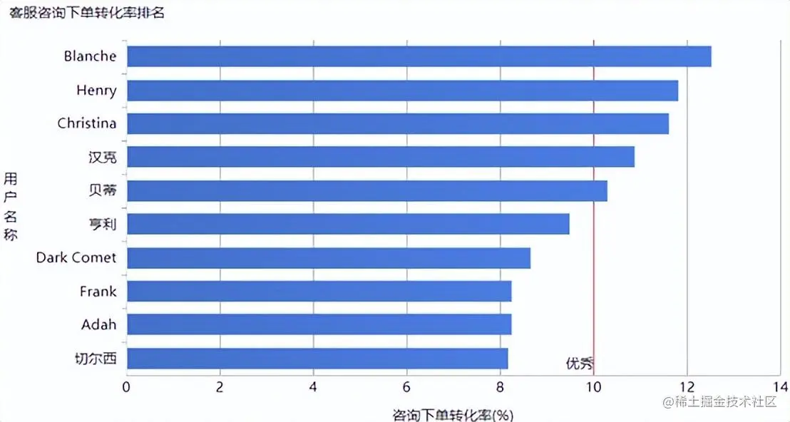 如下图所示,通过BI工具进行客服咨询下单转化率条形图的数据分析统计可以发现,该平台的Blanche、Henry、Christian、汉克、贝蒂这五名客服的转化率比较优秀,并且都在10%以上,其他的客服员工的转化率则相对较低,故而这方面可以让转化率最为优秀的Blanche客服给其他客服做一次服务培训,整体上提升平台的服务水平,进而提升用户的下单转化率。