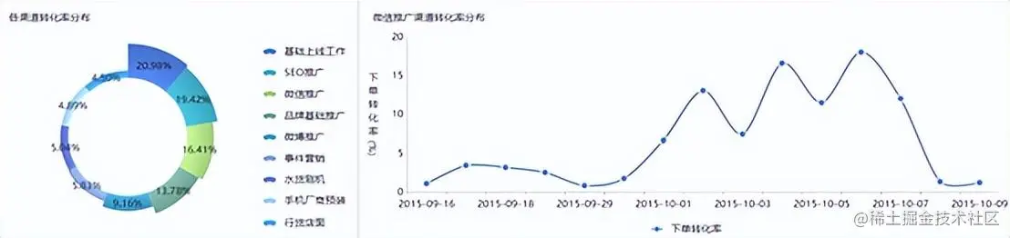 利用BI工具,首先分析出各个营销推广渠道的转化率环形玫瑰分布图。可以看出目前平台的转化率最高的渠道主要是基础上线工作、SEO关键词推广、微信推广、品牌推广几个渠道。同时我们想联动查看每个渠道对应的转化率数据时,通过BI工具提供的数据自动联动过滤功能让用户无需任何设置即可进行所有相关联的数据联动。