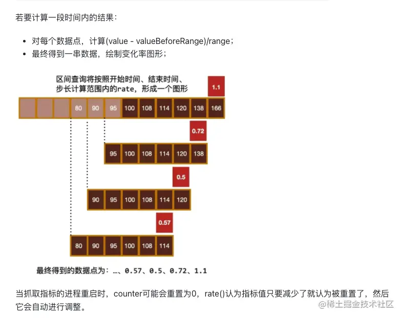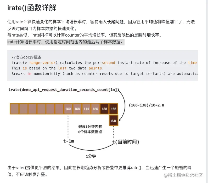 当使用irate函数时,Prometheus会根据最近两个数据点之间的时间间隔计算变化率,而不考虑时间范围内的其他数据点。这使得irate函数更适用于测量瞬时速率,特别是在数据采集间隔较大或数据点不均匀分布的情况下。