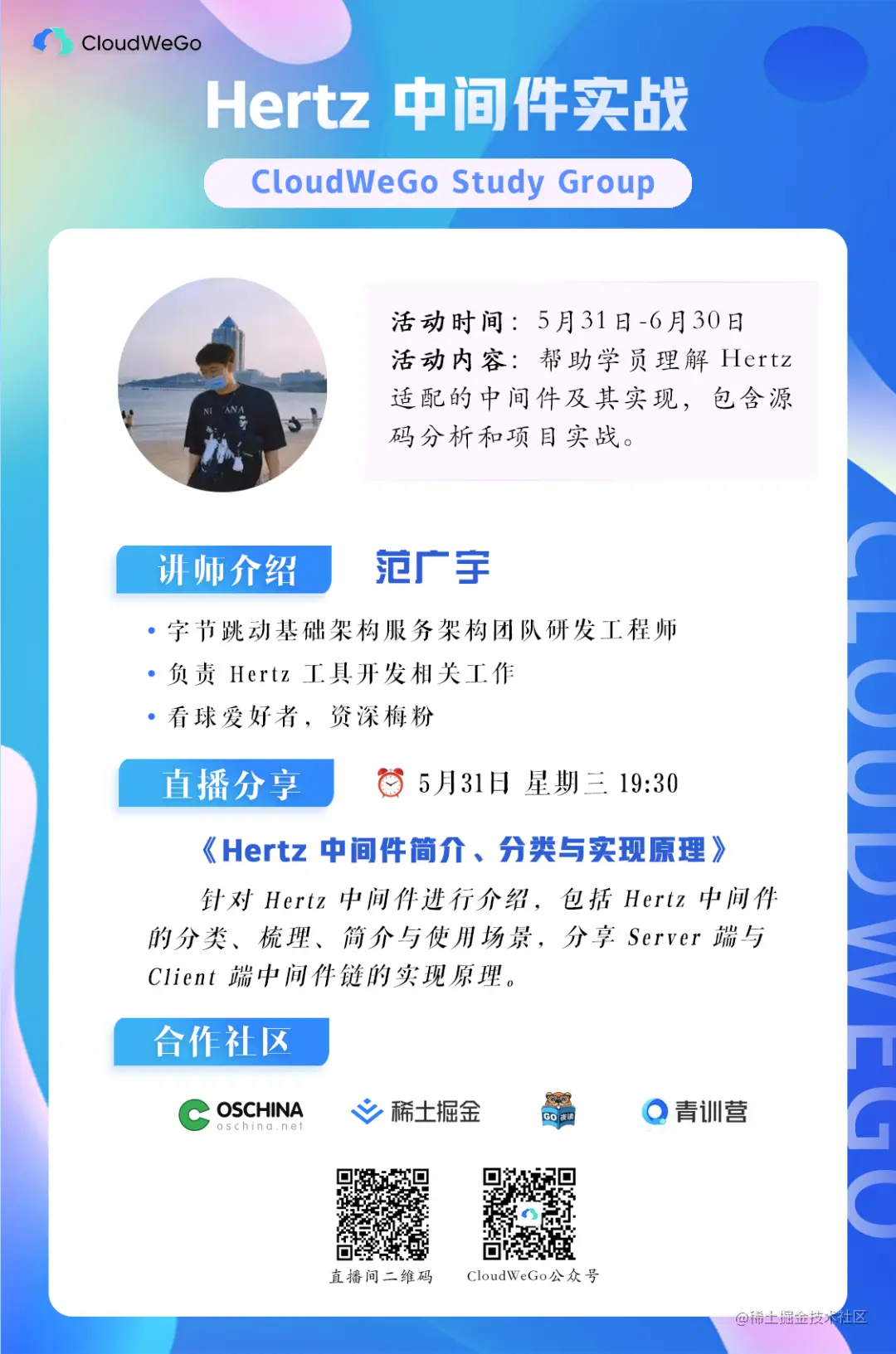 同时本期活动将会安排 3 期直播分享,分享围绕 Hertz 中间件源码解读和项目实战: