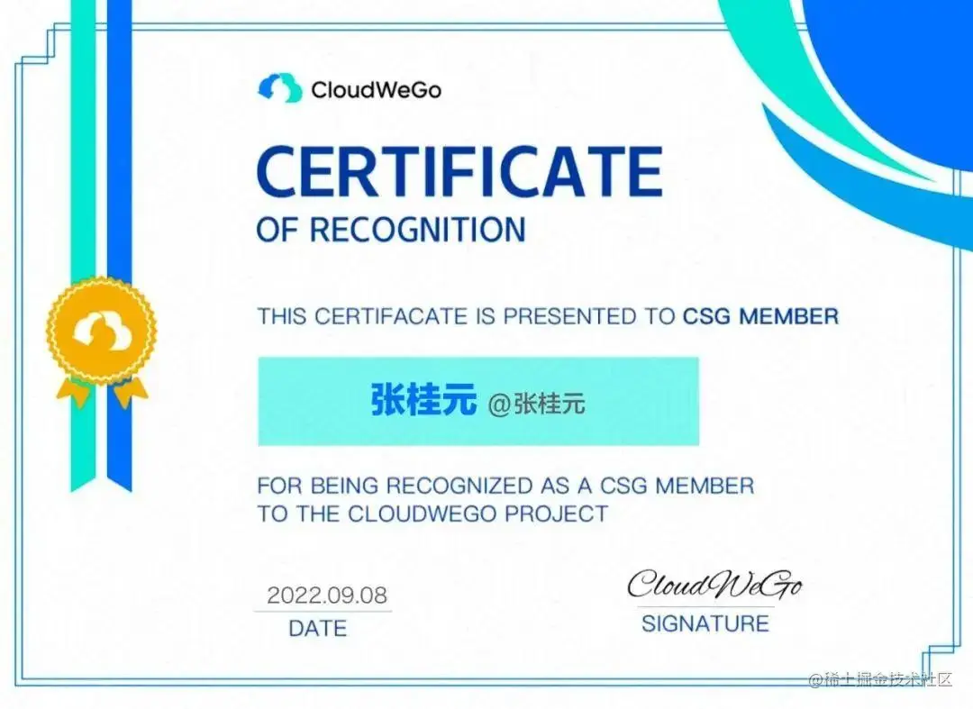 - 完成社区成长经验接力。 贡献笔记、完成学习任务,即可获得 CSG 认证证书。同时有机会对 CloudWeGo 进行深入贡献,参与后续 CSG 活动分享以及社区例会和分享,还有机会获得字节跳动实习机会和内推名额。