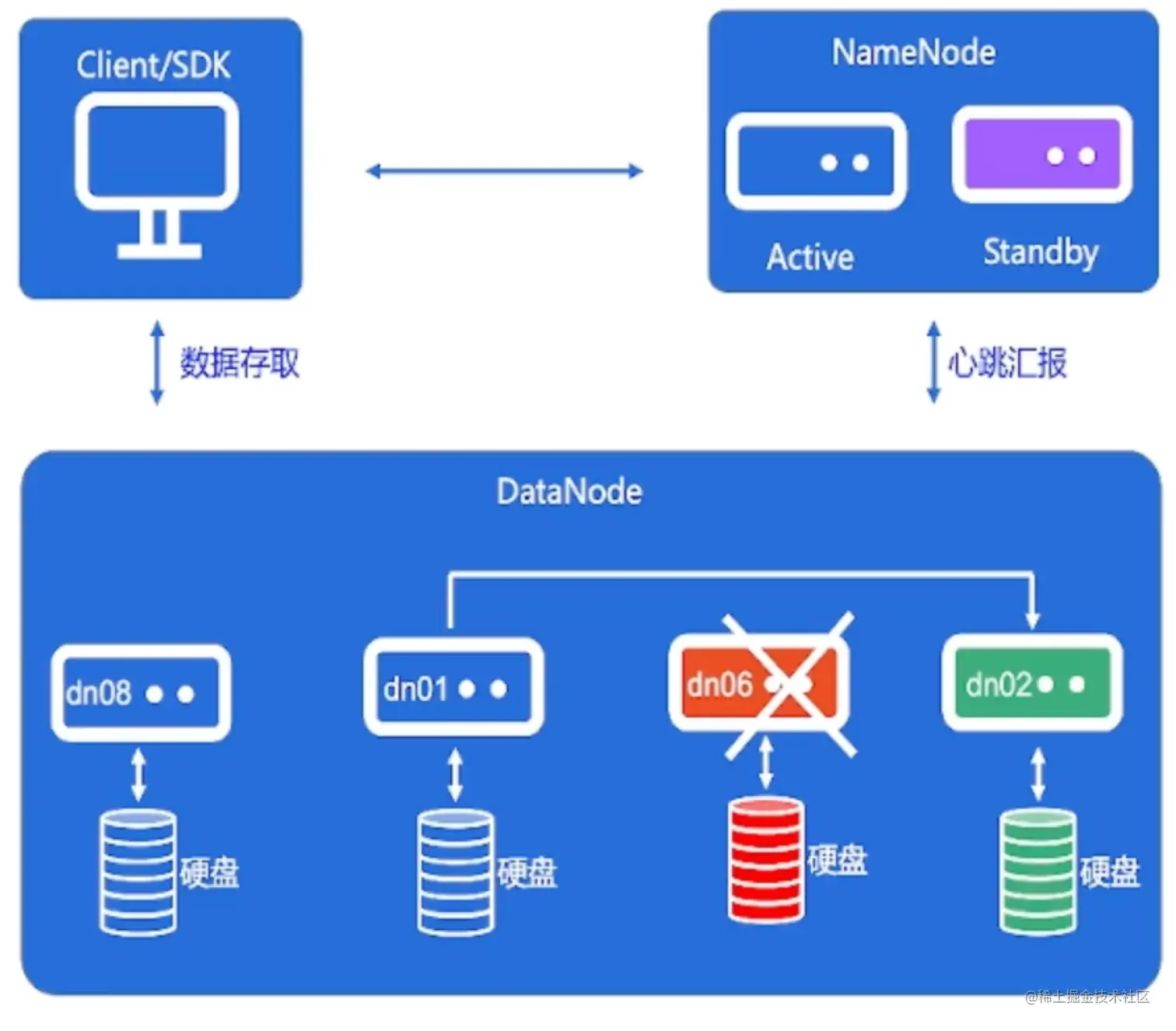 - 维护文件块存放节点信息:通过接收DataNode的心跳汇报信息,维护集群节点的拓扑结构和每个文件块所有副本所在的DataNode类表。