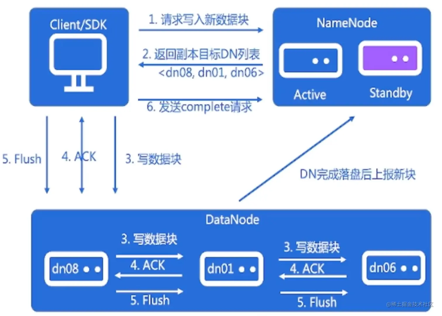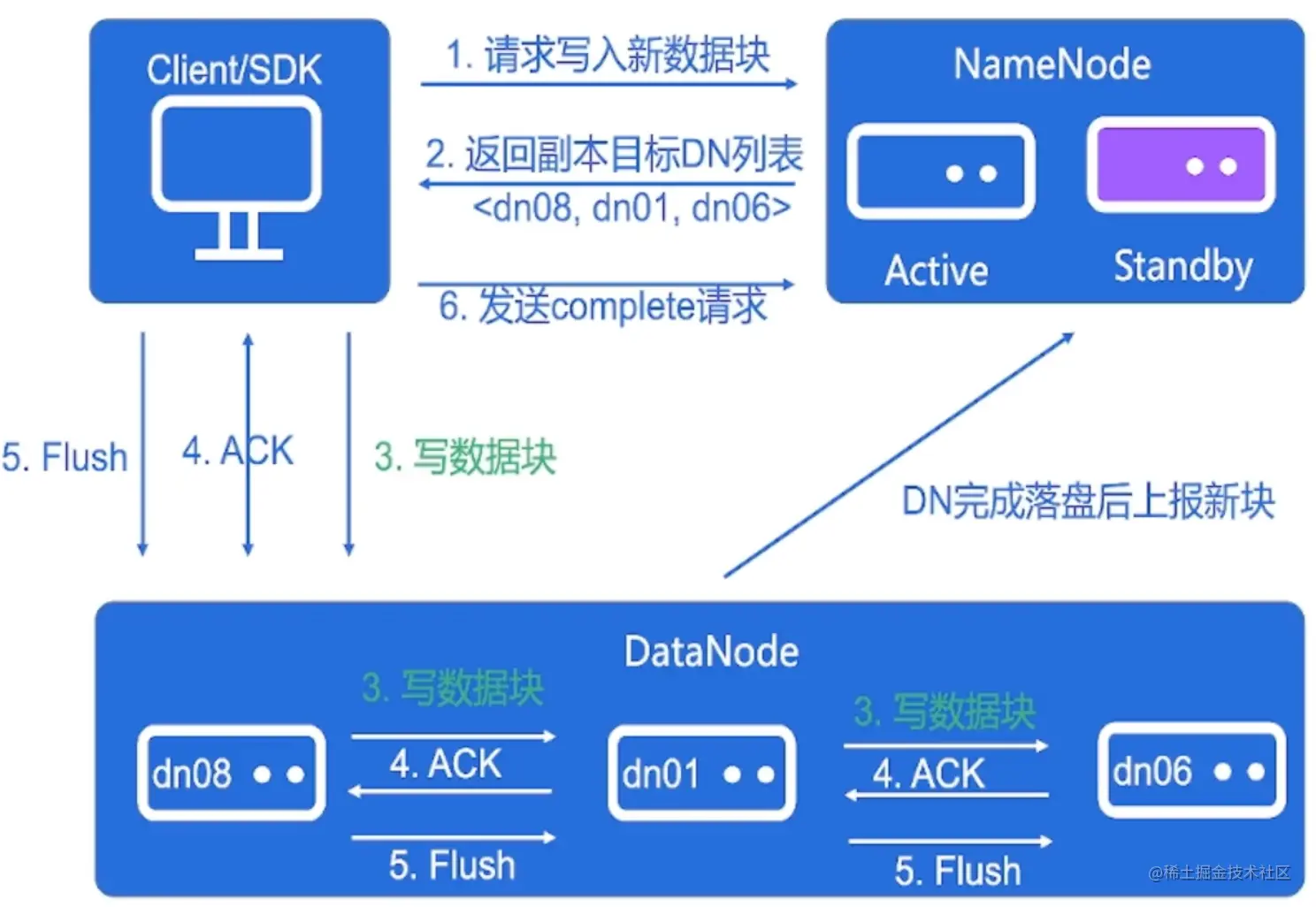 心跳汇报:把存放在本机的数据块列表发送给NameNode,以便NameNode能维护数据块的位置信息,同时让NameNode确定该节点处于正常存活状态