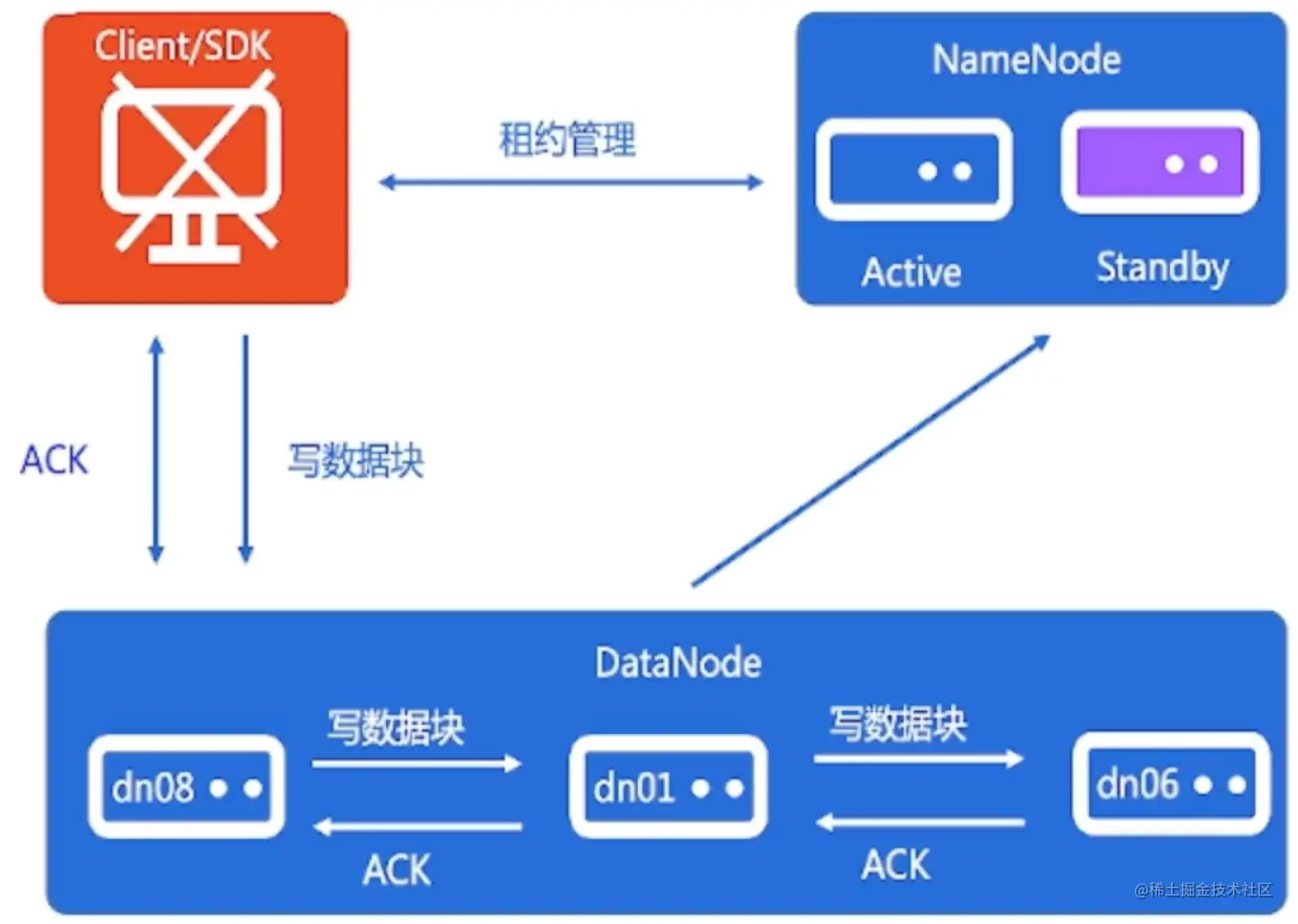 租约:client要修改一个文件时,需要通过 NameNode 上锁,这个锁就是租约 (lease)。