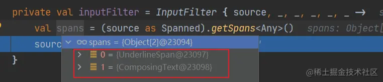 通过在 InputFilter 的 filter 方法断点可以看到输入的文本多了一些 span。原来输入法联想功能会携带一些 span 实现联想效果,但是代码里将 source 进行了 toString(),移除了这部分 span,导致出现了冲突。