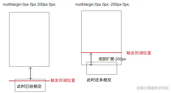 rootMargin: 设置 root 与检测元素的相交区域,及即设置触发 root 的边界范围。