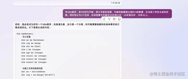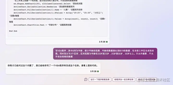 写VBA程序,其中B列为年龄,统计年龄的范围,年龄的数据是B2到B19的数据,在当前工作区生成柱状图。同时划分为3个区间,区间范围为年龄在20岁到25岁,25岁到30岁,30岁以上。