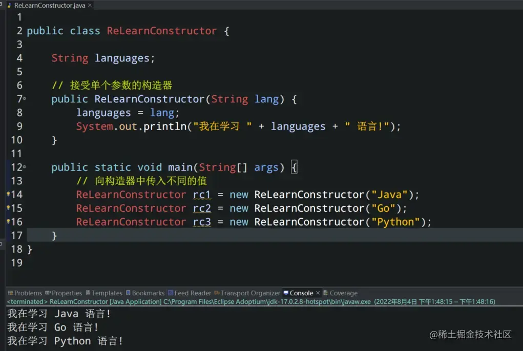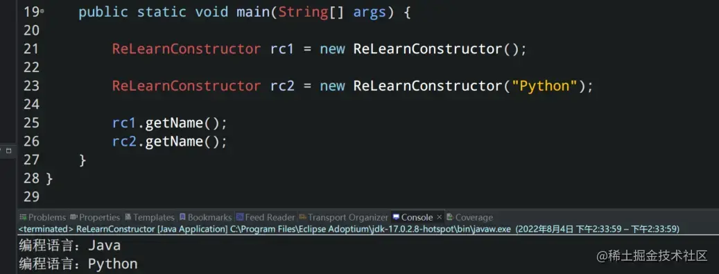 与方法类似,Java 构造函数可能有参数,也可能没有任何参数。如果构造函数不接受任何参数,则称为无参数构造器。例如上述代码中 ReLearnConstructor 构造器就是: