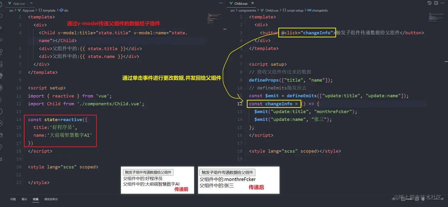 <Child v-model:title="state.title" v-model:name="state.name"></Child>