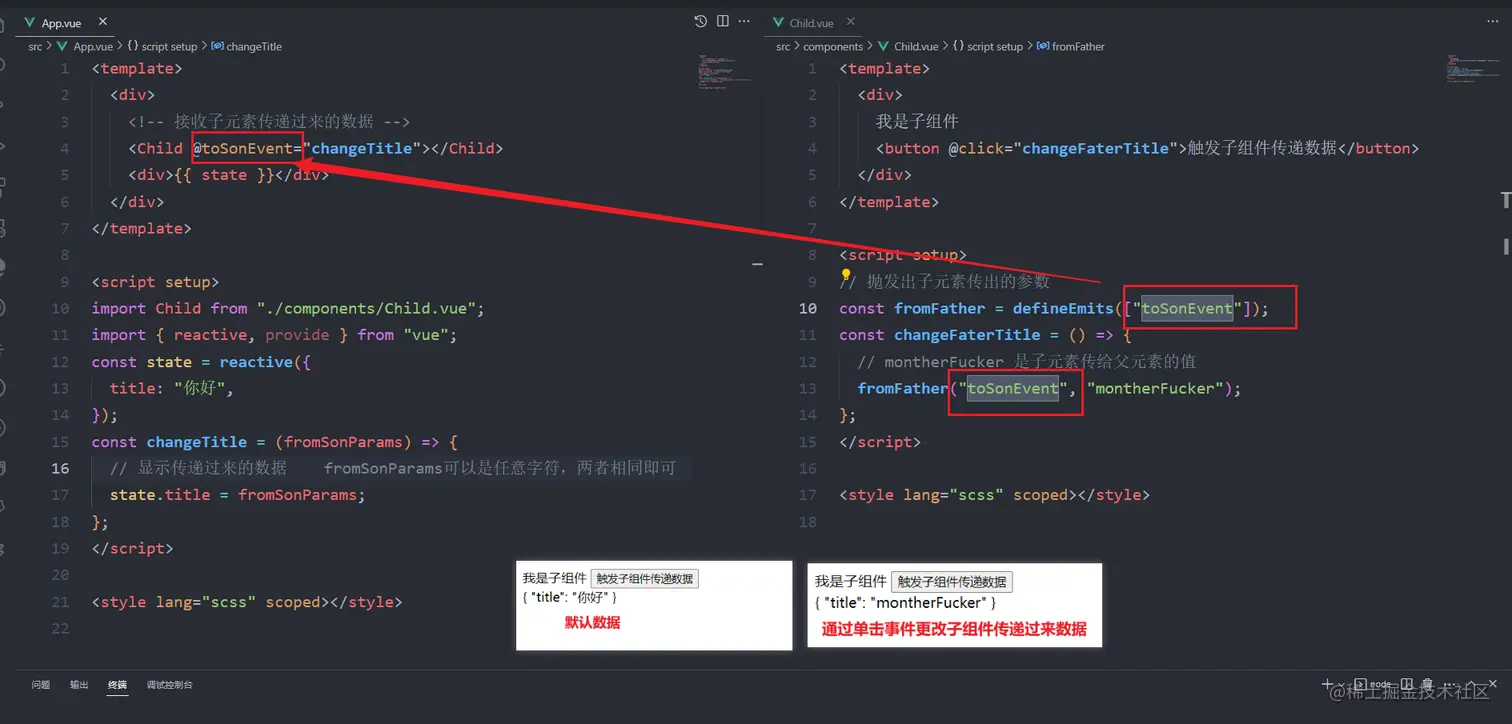 <button @click="changeFaterTitle">触发子组件传递数据</button>