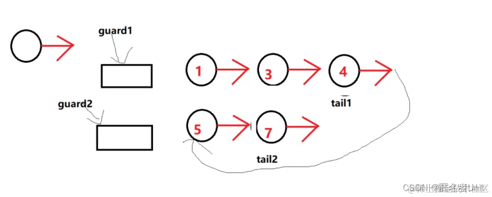 ListNode*guard1,*guard2,*tail1,*tail2;
