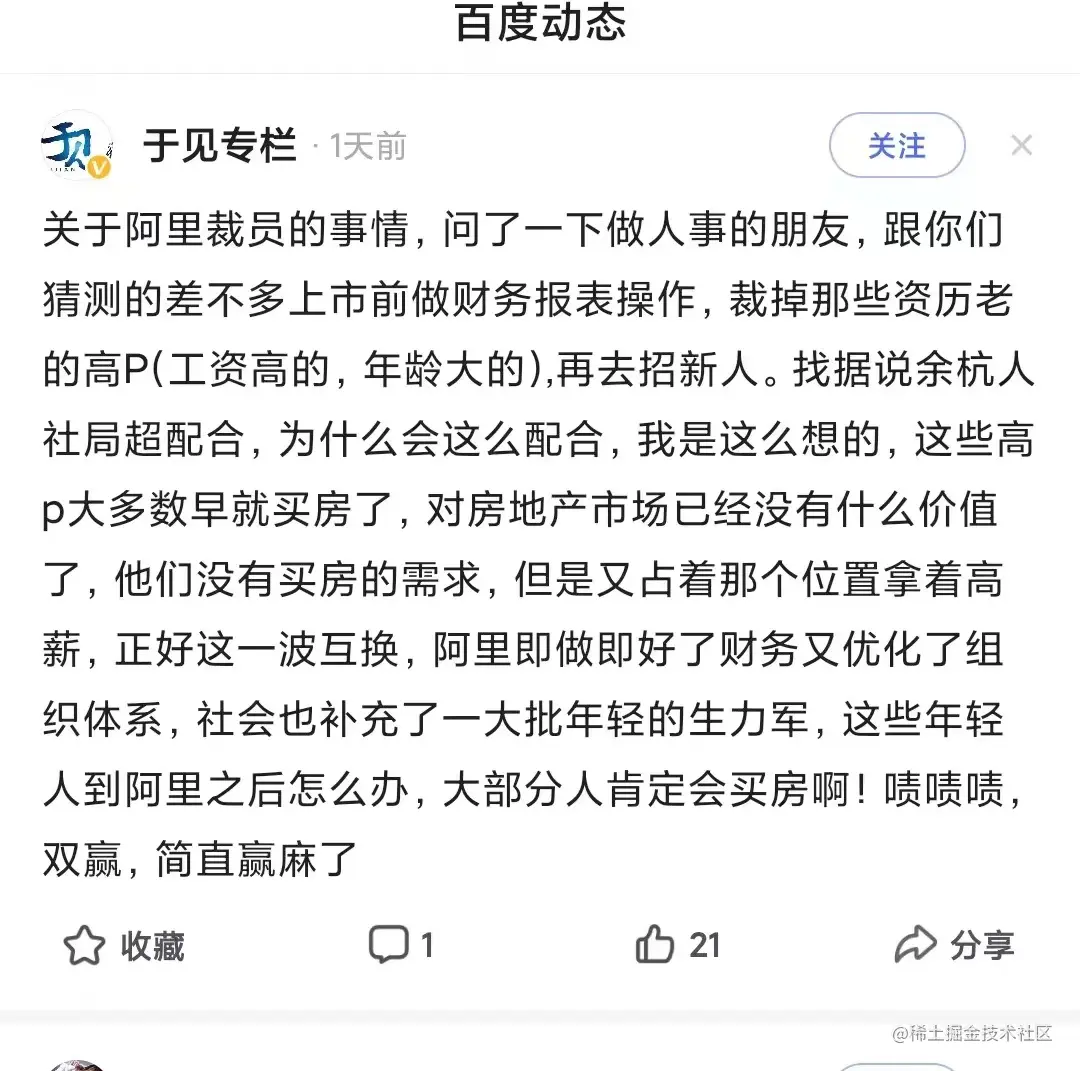 文章首发于微信公众号“前端面试题宝典”,欢迎大家关注,点击前往原文:聊聊最近的阿里大裁员