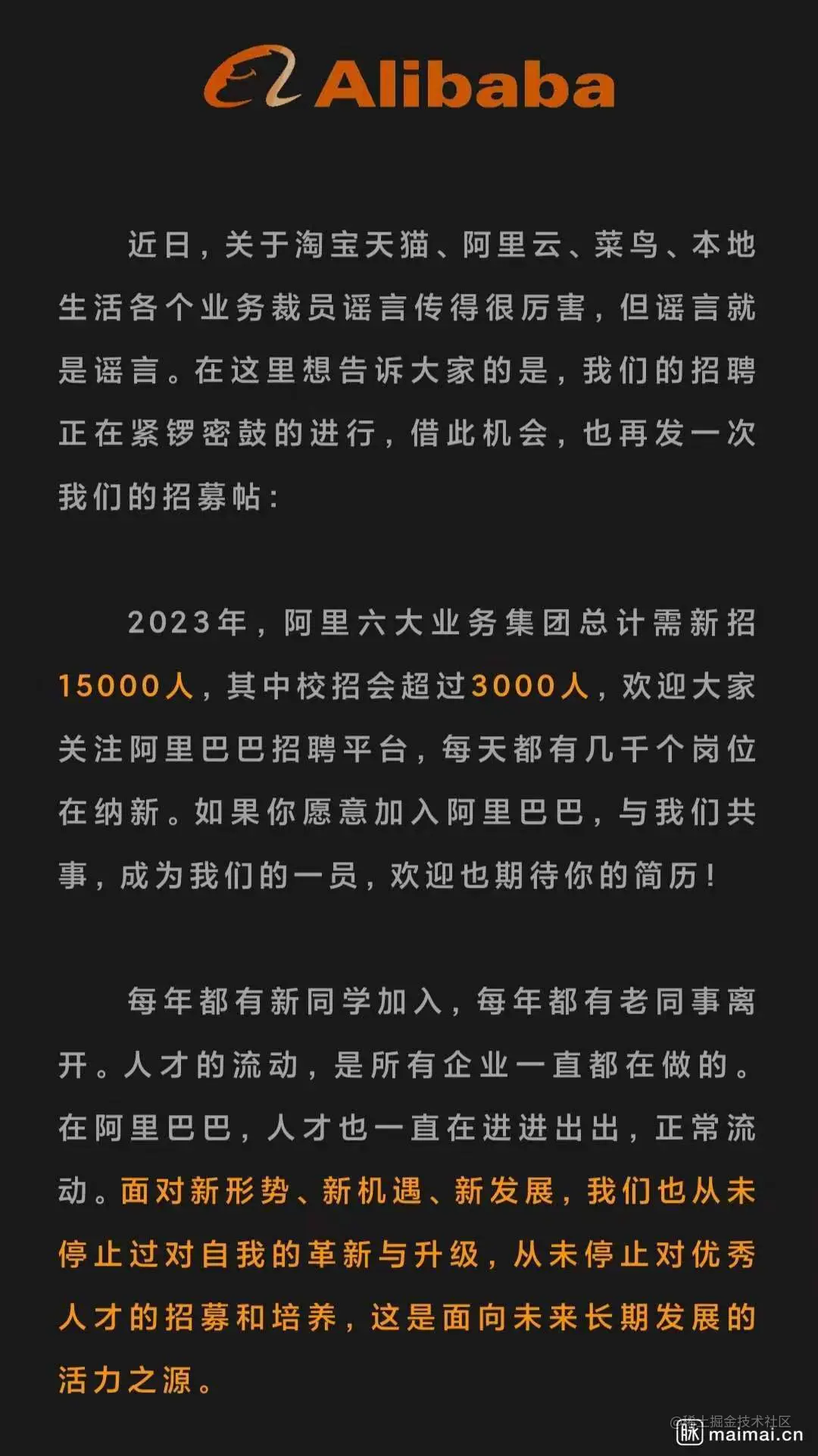 尽管网上不乏自称是阿里员工的人表示确实被裁,但官方很快发表声明,相关裁员消息系“谣言”,并称今年要新招 15000 人。
