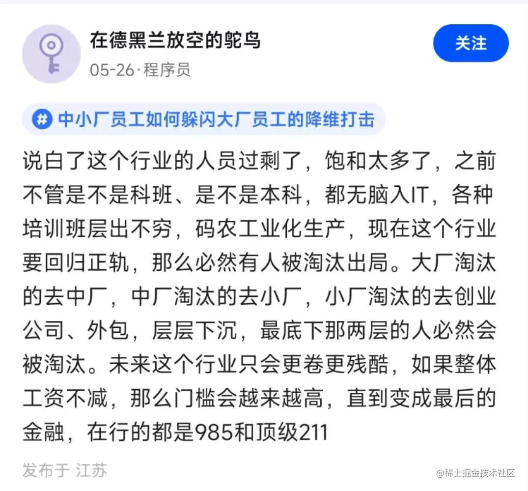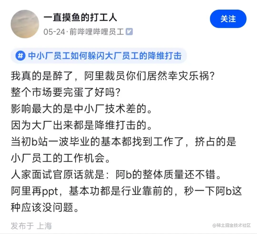正如最近很多人在议论的 “中小厂员工如何躲闪大厂员工的降维打击” 话题。大厂裁员,如果其他的大厂没有提供足够的机会,就会去卷中厂,中厂出来的同学们再去卷小厂。