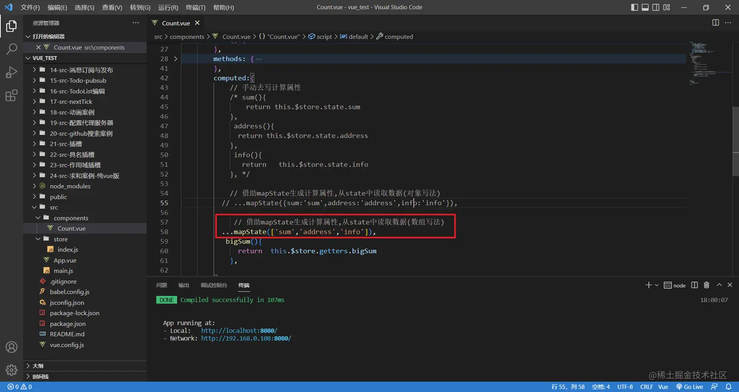 1 mapState方法: 用于帮助我们映射state中的数据为计算属性