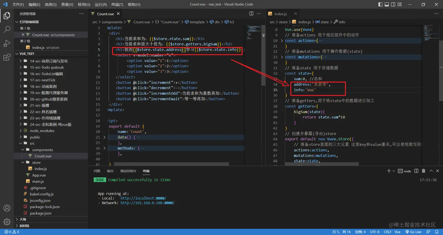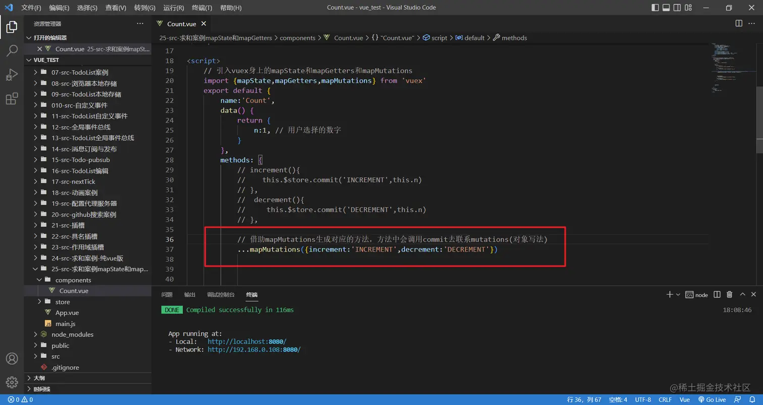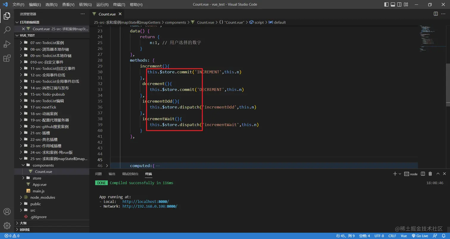 备注:mapActions与mapMutations使用时,若需要传递参数需要:在模板中绑定事件时传递好参数,否则参数是事件对象。