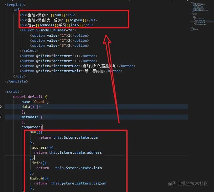 现在想要展示一段文本,其中里面两个参数要存在store的state里面,那么每次获取都要通过这么一大串代码获取,及其复杂且不美观,vue的风格指南就说过插值语法不要写的这么复杂