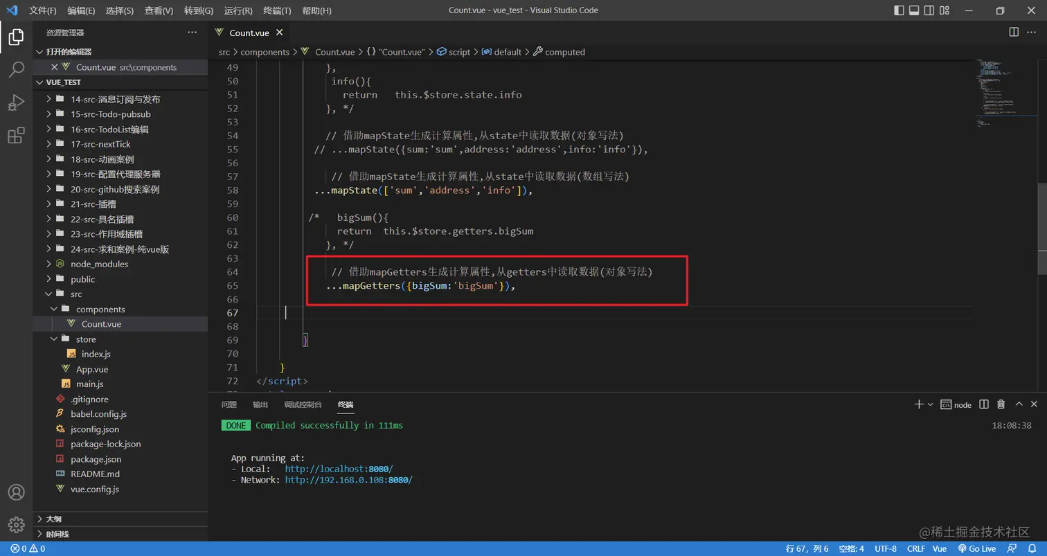 2 mapGetters方法: 用于帮助我们映射getters中的数据为计算属性