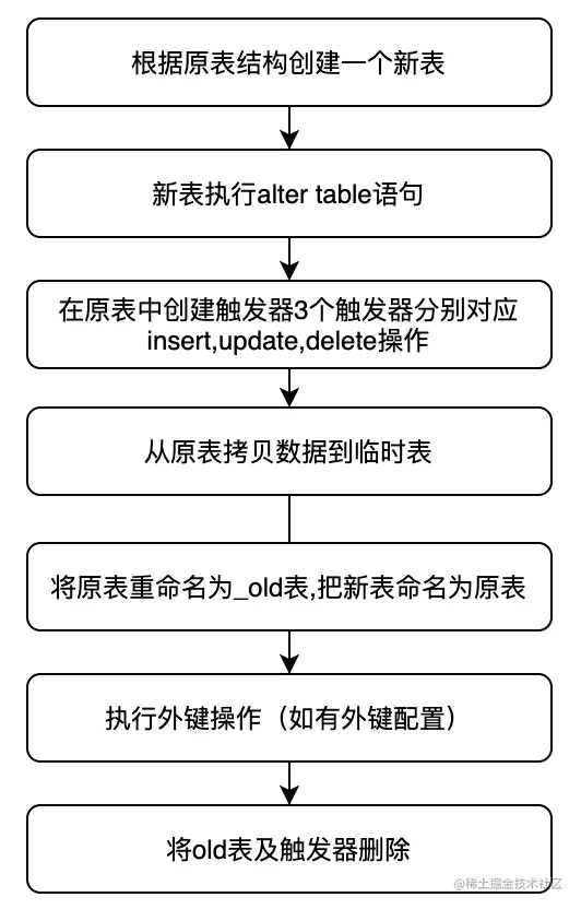 pt-osc 用于修改表时不锁表,简单地说,这个工具创建一个与原始表一样的新的空表,并根据需要更改表结构,然后将原始表中的数据以小块形式复制到新表中,然后删除原始表,然后将新表重命名为原始名称。在复制过程中,对原始表的所有新的更改(insert,delete,update)都将应用于新表,因为在原始表上创建了一个触发器,以确保所有新的更改都将应用于新表。有关 pt-online-schema-change 工具的更多信息,请查阅手册文档 。