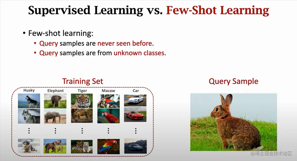 解释一下 few-shot learning 的概念,如上图分类任务,训练集中没有兔子,但如果想输入兔子的图片,让模型返回 告诉我这是一只兔子,该怎么办?在这里,可以给模型提供一些样例,样例是兔子的图片以及分类结果,模型看完这些样例后,再问模型这张图片是什么动物,模型就能告诉你是兔子,实际上模型学习到的是物品与物品之间的相似度,所以只要给样例,它就有能力识别出来。shot 指代的就是样例,zero-shot 就是零样本,few-shot 就是少样本。